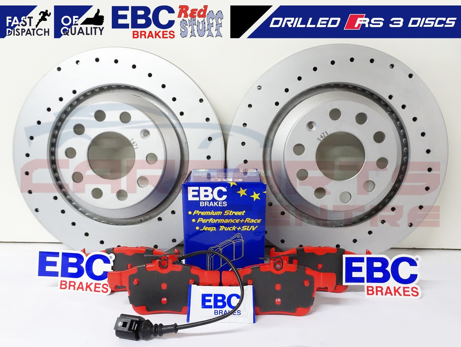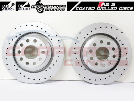 FOR AUDI RS3 8V 2015- REAR PERFORMANCE DRILLED BRAKE DISCS EBC RED STUFF PADS